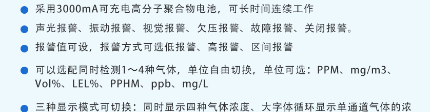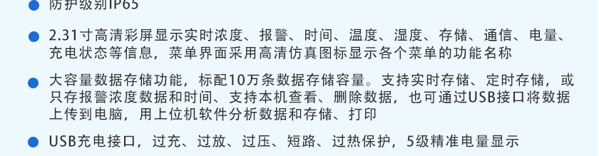 采用進口催化燃燒傳感器和微控制器技術,帶2.5寸高清彩屏實時顯示,帶聲光+視覺報警,現場多種氣體濃度 24 小時連續在線監測及溫濕度的測量,適用于各種環境中的可燃氣體濃度檢測,響應速度快,測量精度高,穩定性和重復性好,整機性能居國內領先水平。儀器具有多種超強的電路保護功能,可防止錯接電源、反接電源、電源短路、電源不穩、電源與信號錯解等,導致的儀器損壞。