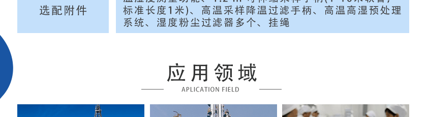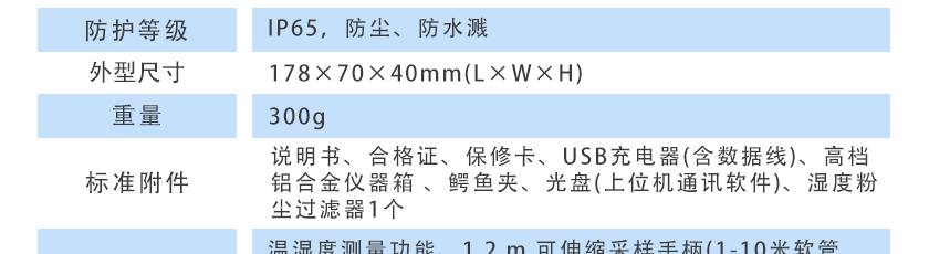 溫濕度測(cè)量功能、1.2 m 可伸縮采樣手柄(1-10米軟管,標(biāo)準(zhǔn)長(zhǎng)度1米)、高溫采樣降溫過(guò)濾手柄、高溫高濕預(yù)處理系統(tǒng)、濕度粉塵過(guò)濾器多個(gè)、掛繩 |