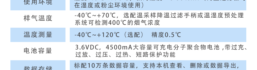 -40℃~+70℃ ,選配高溫采樣降溫過(guò)濾手柄,可檢測(cè)400度或更高溫度的煙氣濃度 |