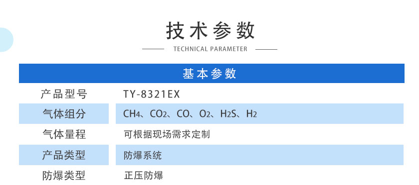 • 防爆壁掛式沼氣分析系統 TY-6090EX 采用進口NDIR非分光紅外傳感器,長壽命電化學傳感器,運用先進的數字處理技術,可同時測量沼氣中CH4、CO2、H2S、O2、CO、H2的體積濃度,根據氣體濃度值快速準確計算出相應的熱值。