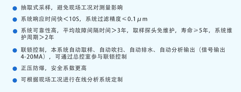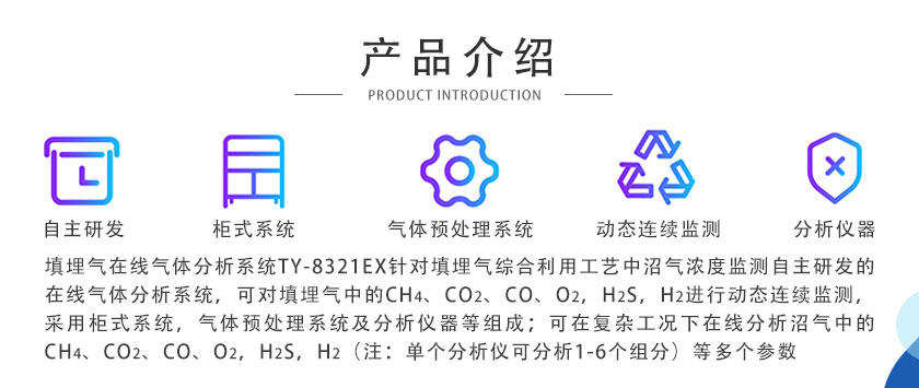 針對填埋氣綜合利用工藝中沼氣濃度監測自主研發的在線氣體分析系統,可對填埋氣中的CH4、CO2、CO、O2,H2S,H2進行動態連續監測。 填埋氣在線氣體系統(TY-8321EX)采用柜式系統,氣體預處理系統及分析儀器等組成;可在復雜工況下在線分析沼氣中的CH4、CO2、CO、O2,H2S,H2(注:單個分析儀可分析1-6個組分)等多個參數。 針對我國垃圾填埋場現場惡劣的工況條件,天禹智控自主研發紅外氣體傳感器、電化學氣體傳感器、利用多年成熟的分析控制技術和預處理取樣技術,創造性的設計提供方案。