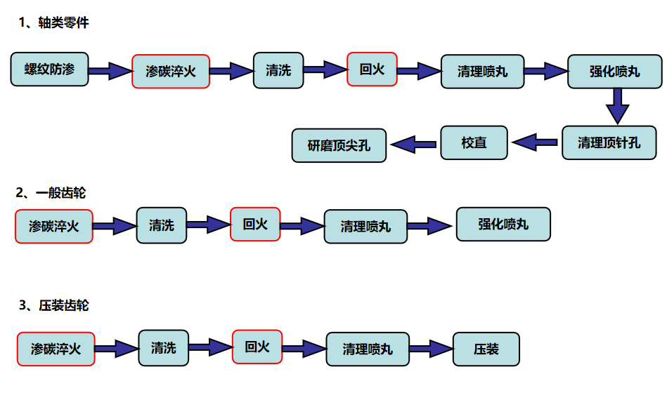 在生產(chǎn)中,一般常把熱處理分為預(yù)備熱處理和最終熱處理兩類。一般比較重要的零件制造過程大致是: