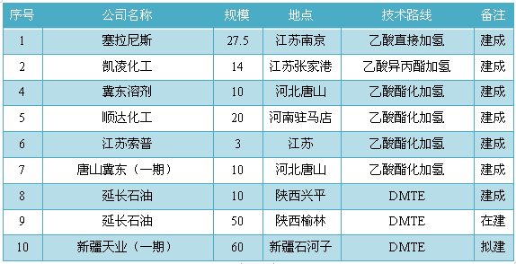 煤經合成氣制乙醇項目在國內發展較快,目前已經建成產能94.5萬噸,在建和擬建產能達110萬噸,總產能達204.5萬噸。