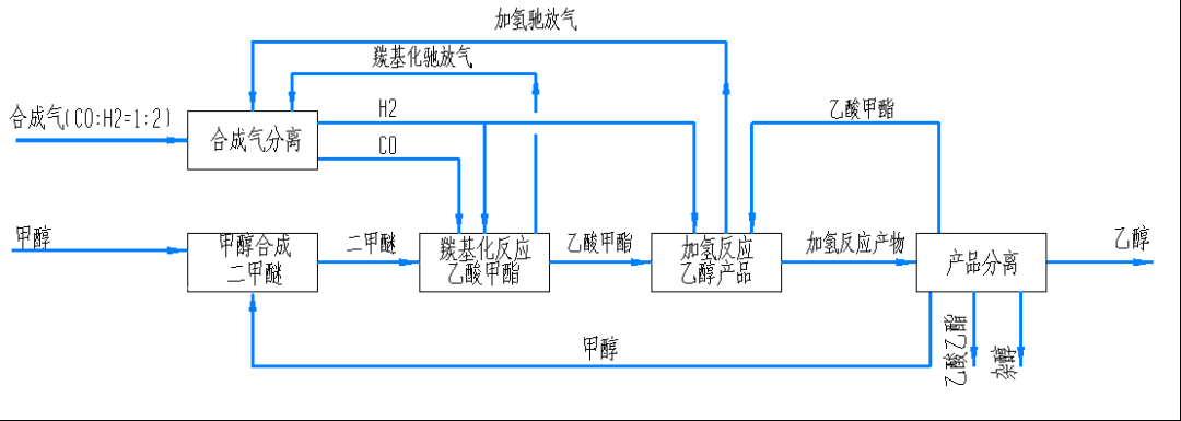 其中DME可來源于合成氣直接合成,也可經甲醇脫水得到,分離雜質后,二甲醚汽化與CO混合進入羰基化反應器,生成乙酸甲酯(MAC),分離雜質后乙酸甲酯與氫氣在加氫反應器中生成乙醇和甲醇,經分離后乙醇作為產品,甲醇返回二甲醚合成單元作為原料又可循環利用。