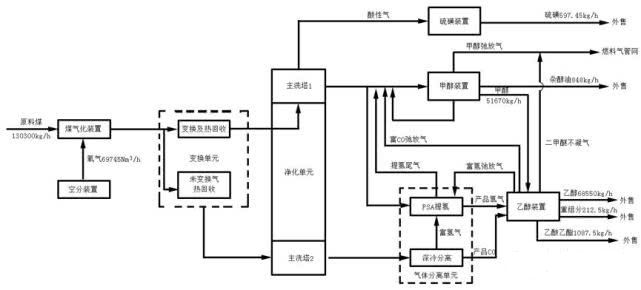 該項目以西灣露天煤礦為原料,采用HT-L煤氣化技術生產粗煤氣,其中一股粗煤氣進行變換,另一股粗煤氣進行余熱回收利用,再分別經過低溫甲醇洗脫除其中的硫和二氧化碳,未經變換的煤氣凈化后經過深冷分離為H2和CO,經變換的煤氣部分送PSA制氫、部分送甲醇合成裝置生產甲醇,CO、H2和甲醇送乙醇裝置。流程示意如圖1。