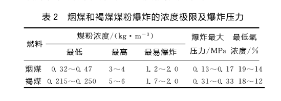 3煤粉濃度。煤粉和空氣混合在一定濃度時,由于明火或煤粉沉積物自燃而引起爆炸。煤粉爆炸性隨著它在空氣中的濃度增大而變大,當濃度增加到一定限度時,爆炸性又開始減小。表2列出了煙煤和褐煤煤粉爆炸的濃度極限及爆炸壓力。