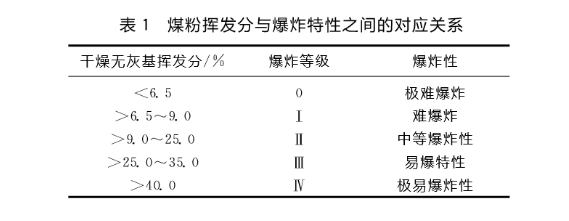 1)煤粉的揮發分。一般來講,揮發分越高、發熱量越高、活性越高、活化能越低,越容易爆炸。揮發分Vdaf6.5%,煤粉幾乎不爆炸,Vdaf25%時煤粉就容易發生自燃,爆炸的危險性增強。煤粉的揮發性和爆炸特性之間的對應關系見表1