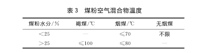 5混合物溫度。煤粉空氣混合物溫度越高,爆炸的可能性越大。一般煤粉空氣混合物不宜超過表3中的溫度。