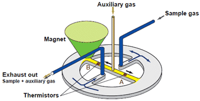 這是利用氧順磁性的方法之一。當樣品氣體含有氧氣時,氧氣被吸入磁場,從而降低氣流B中輔助氣體的流速。由氣流B中流動限制的影響引起的兩個氣流A和B的流速差與樣品氣體的氧氣濃度成比例。流速由熱敏電阻決定,并轉換成電信號,其差值作為氧信號計算。