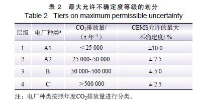 考慮到監(jiān)測成本和數(shù)據(jù)質量的必要性,按年度CO2 排放量確定數(shù)據(jù)質量的層級。數(shù)據(jù)質量等級共分為4 級,排放量越少層級越低,數(shù)據(jù)質量要求也越低。在確保數(shù)據(jù)達標的情況下盡力減少企業(yè)的成本。表2 給出了各層級數(shù)據(jù)允許的最大不確定度。