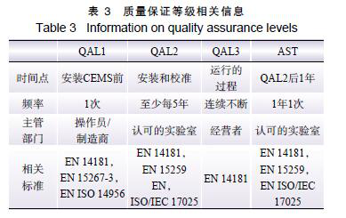 歐盟的質量控制共包含3 個質量保證級別(quality assurance levels,QAL)和1 個年度監(jiān)視測試(annual surveillance test,AST),從儀器的安裝到年度的檢測, 歐盟對數(shù)據(jù)進行持續(xù)性把控,確保數(shù)據(jù)質量始終處于規(guī)定的不確定度范圍內, 及時調整儀器, 減少系統(tǒng)誤差。各質量保證級別測試時間、頻率、主管部門和相關標準見表3。