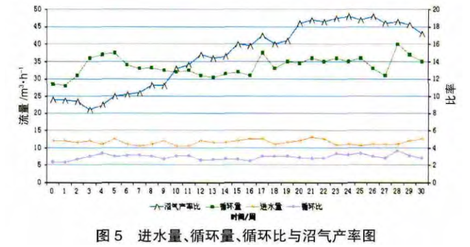 圖5為進水量、循環量、循環比與沼氣產率圖,從圖中可以看出,厭氧反應器進水達到設計流量12.5m3/h左右時,厭氧反應器出水循環量大都集中在30~40m3/h,循環比在250%~320%內波動,1m3滲濾液沼氣的產率約9~19m3,沼氣的產率系數為每去除1kgCOD產生0.5m3沼氣,沼氣產率與COD產率線性相關,COD的去除率直接影響到沼氣的產率。