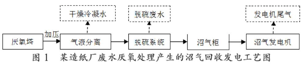 造紙廠在紙漿造紙的生產(chǎn)加工過(guò)程中有大量的廢水產(chǎn)生,該廢水中的COD、BOD濃度較高,可生化程度較大,大多數(shù)利用厭氧+好氧生化處理工藝聯(lián)合治理。在對(duì)造紙廢水進(jìn)行厭氧處理時(shí)會(huì)有沼氣產(chǎn)生,目前大多數(shù)造紙廠直接采用火炬燃燒的模式來(lái)處置生產(chǎn)廢水治理過(guò)程中產(chǎn)生的沼氣,沒(méi)有得到資源化利用。