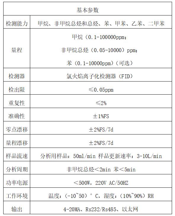 天禹VOC在線檢測(cè)系統(tǒng)主要性能參數(shù)