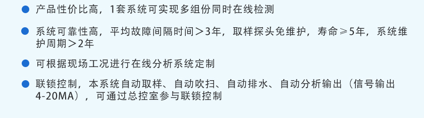 天禹智控在線紅外煤氣熱值分析系統TY-8331,抽取式采用分析,主要應用于高爐噴煤分析、熱風爐煙氣分析、高爐煤氣分析、轉爐煙氣分析、轉爐煤氣回收分析、煤氣柜安全分析、精煉爐爐氣分析、干熄焦循環氣分析、電捕焦安全分析、焦爐煤氣分析、加熱爐優化燃燒、煤氣熱值分析、排放煙氣連續監測分析、高爐富氧系統分析。 在線紅外煤氣熱值分析系統通常采用儀表柜式或分析小屋,由取樣探頭、樣品預處理及分析儀器等組成;可在復雜工況下在線分析煤氣包括CO、O?、CO?、H?、CH?、CnHm(注:單個分析儀可分析1-6個組分)等多個參數,針對我國煤氣現場惡劣的工況條件,天禹智控自主研發紅外氣體傳感器、順磁氣體傳感器或電化