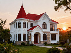 外墻采用水泥纖維掛板,屋頂采用瀝青瓦