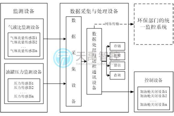 加油站油氣回收在線監測系統由現場端傳感層、傳輸層、中心端應用三部分組成,現場端部分為安裝傳感器,信號處理數據傳輸主要內容