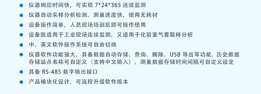 8)儀器響應(yīng)時(shí)間快,可實(shí)現(xiàn) 7*24*365 連續(xù)監(jiān)測(cè)。